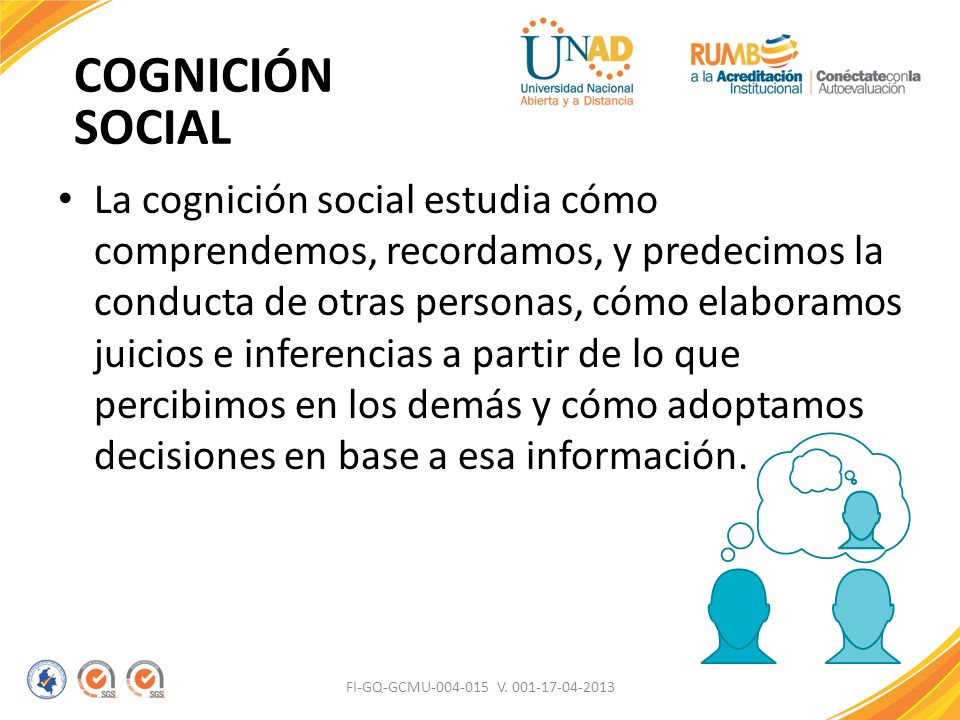Cognición Social uno de los campos de investigación más significativos dela Psicología; en la que hace referencia al conocimiento que tienen laspersonas sobre los seres humanos y sus actividades. Pues la cogniciónsocial es un área de estudio con autonomía propia respecto a la conductasocial.Los estudios de la Psicología social, así como también la socialización, enel campo de la Psicología evolutiva, representan planteamientos muydiferentes a los de la Psicología de la cognición social. La diferenciafundamental radica en que los primeros constituyen básicamente trabajosdescriptivos de la conducta social de los individuos (adulto o en desarrollo)en distintos contextos sociales; Mientras que la cognición social puededefinirse como el área que estudia las ideas, categorías y principios queestructuran nuestro conocimiento del mundo social y lo procesos implícitosen la elaboración de tal conocimiento.Esperamos que esta exhaustiva investigación cumpla con todas lasexpectativas citadas por el profesor de la asignatura. No debemos de dejar de poner en relieve sus constantes y eficientes enseñanzas sobre lo querespecta a la